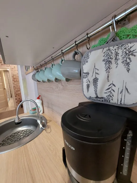 На комфортной кухне есть газовая плита, столовые приборы, набор посуды, кофеварка, электрочайник, микроволновая печь, холодильник, тостер.