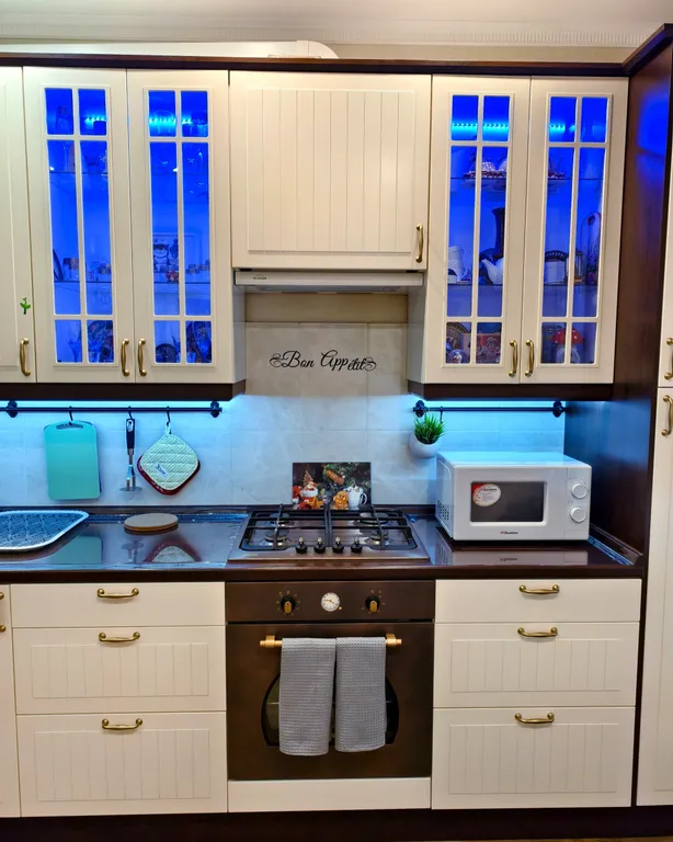 Обустроенная и большая, столовые приборы, микроволновая печь, электрочайник, холодильник, фильтр для воды (с ультрафиолетовым обеззараживанием, можно пить сразу из под крана), чай, кофе, сахар и много приятных сюрпризов.
