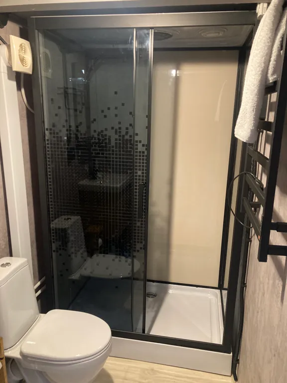Душ, уборная, кондиционер, полотенца, ванный набор, фен
