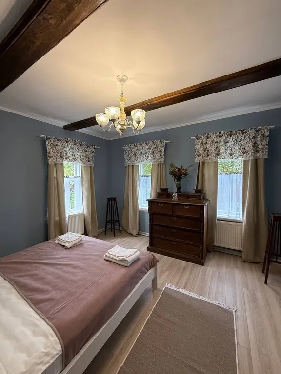 -уютные спальные комнаты с просторными кроватями и качественным бельем (3 двуспальные кровати и одна односпальная), гостиную с пианино середины прошлого века,террасу для утреннего чаепития;
