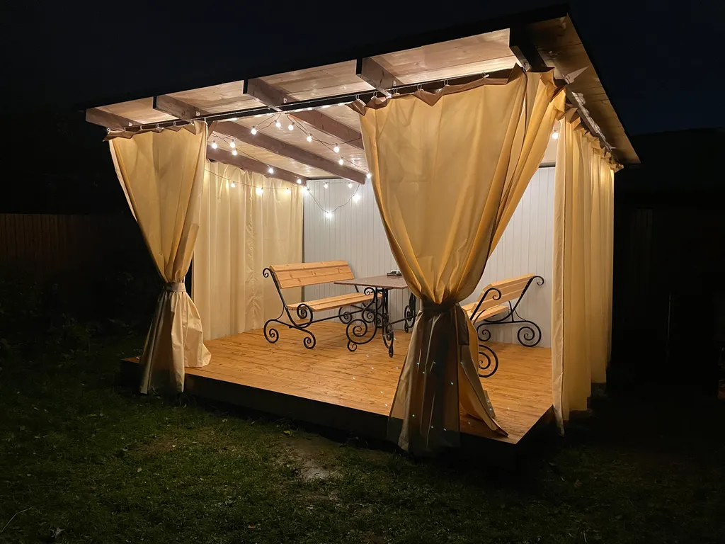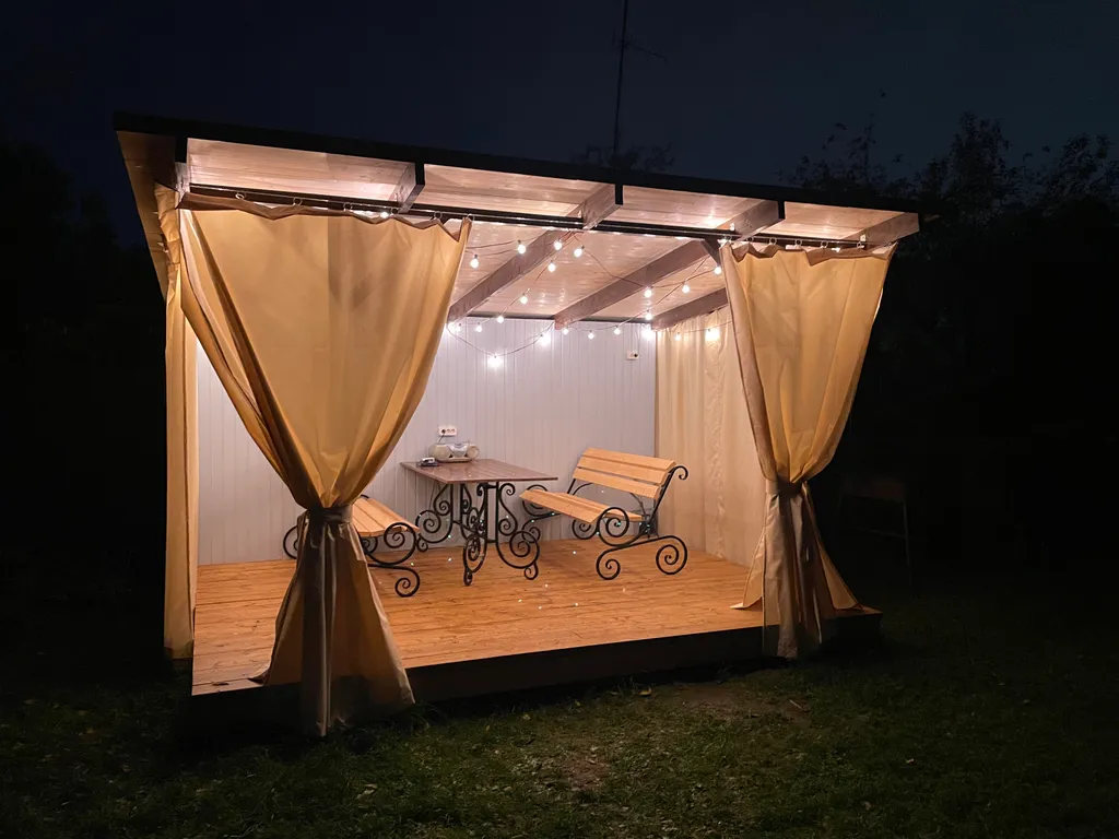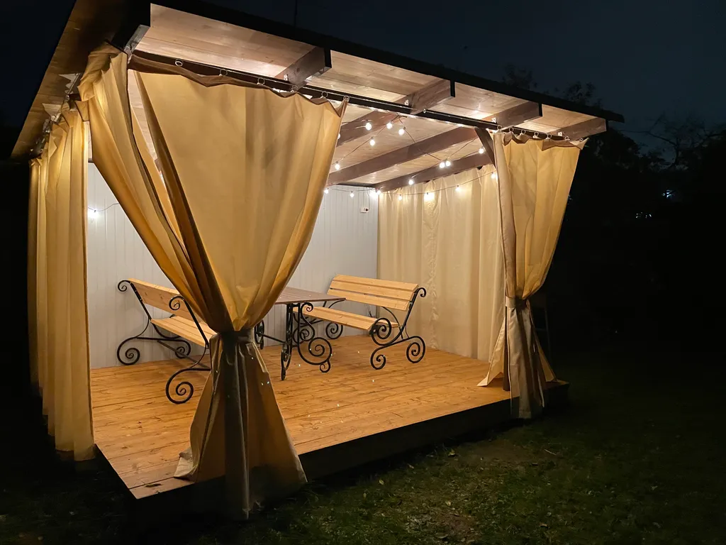 -территорию с зеленым садом, мангалом, качелями и скамейкой для отдыха;