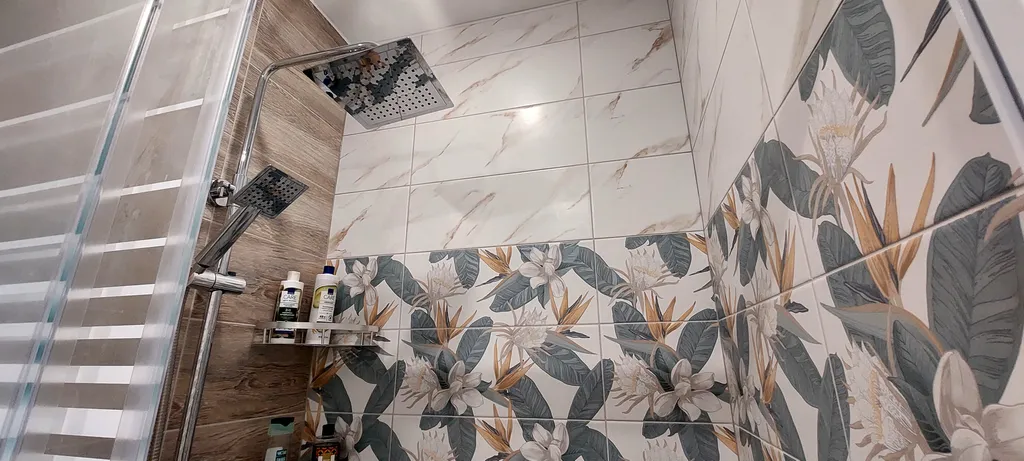 Просторная ванная комната с душевой, оснащённой тропическим душем.