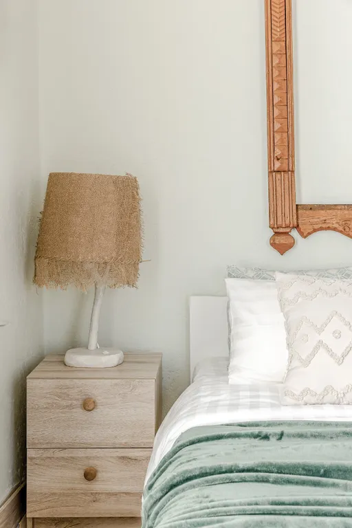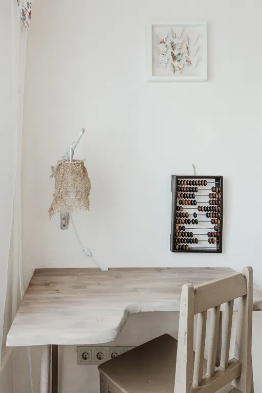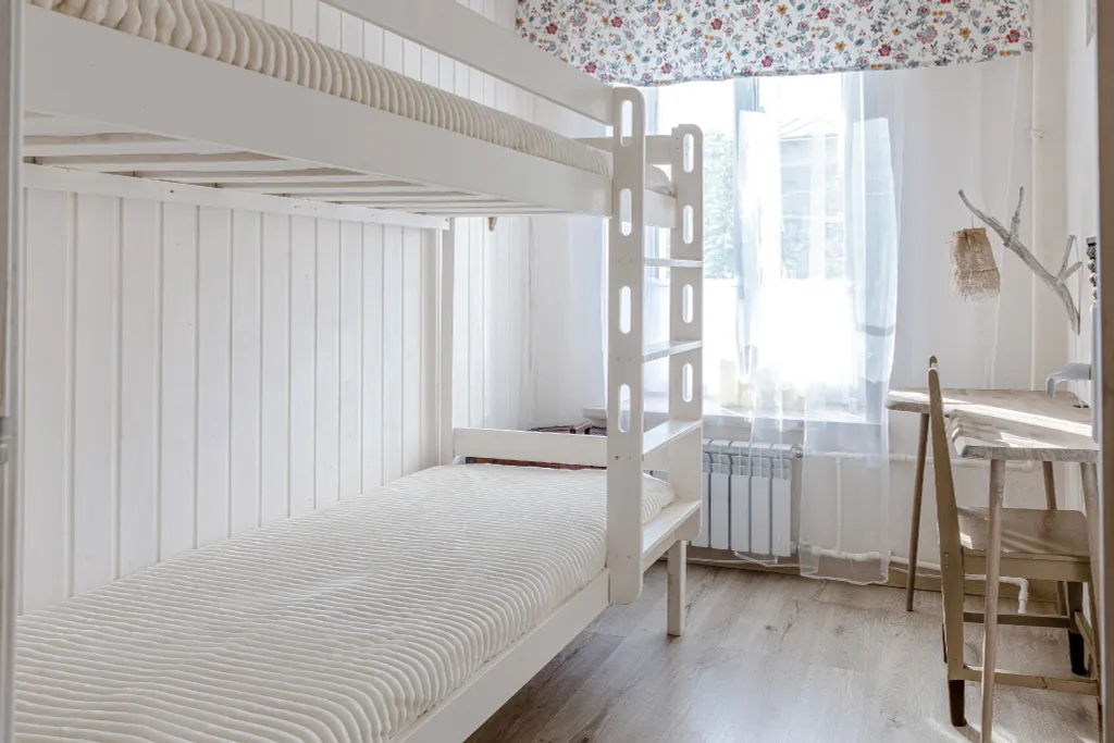 В маленькой комнате – двухъярусная кровать ИКЕА 90 см на 200 см, стол и стул, вешалка.