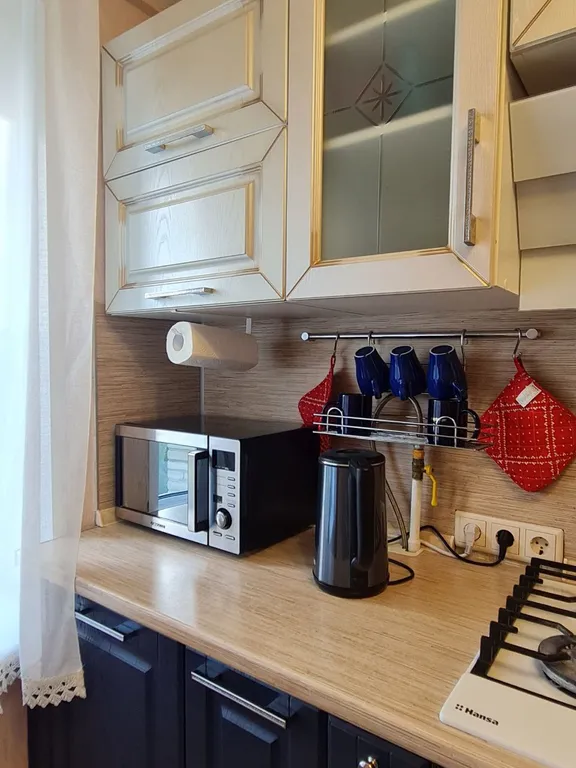 Кухня со стационарным фильтром воды и электрическим чайником, варочной поверхностью и духовым шкафом, холодильником и микроволновкой;