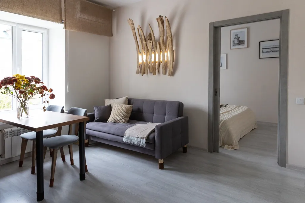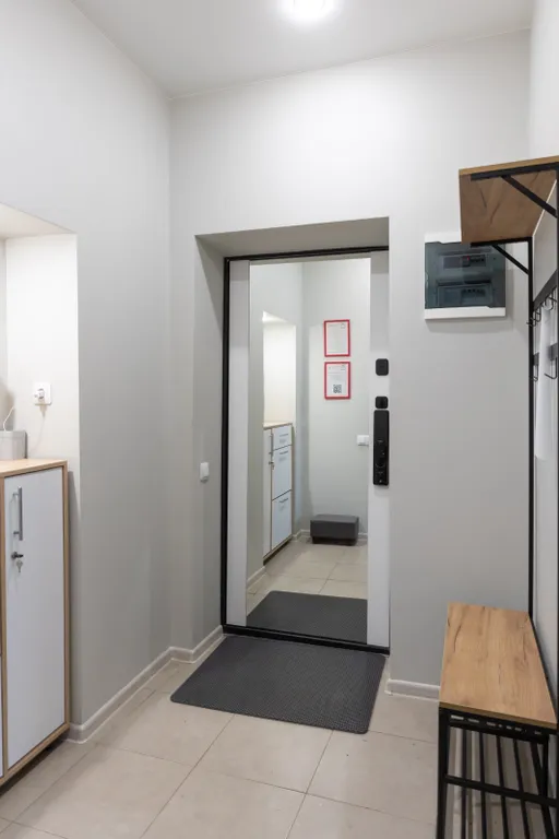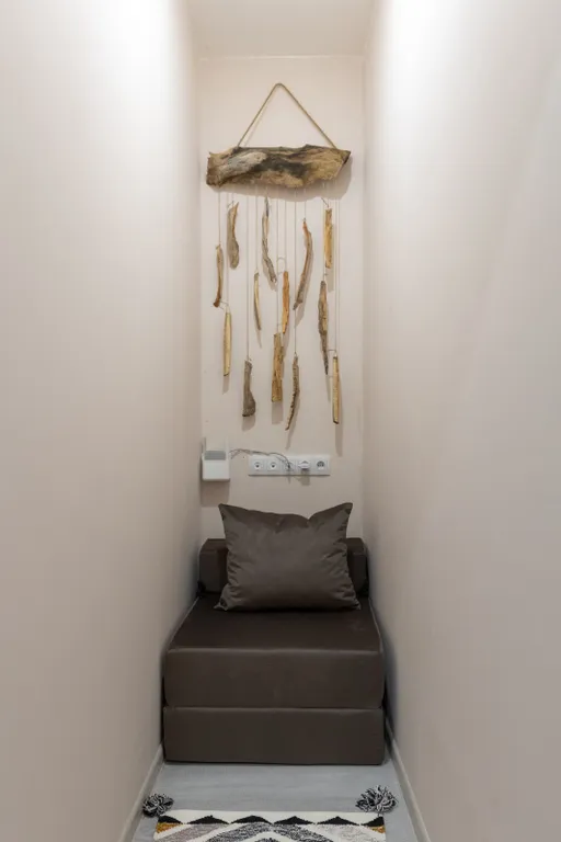 В квартире 1 изолированная спальня (8 м2), кухня с раскладным диваном (18 м2), потайная комната (2, 5 м2), санузел с ванной (4 м2).