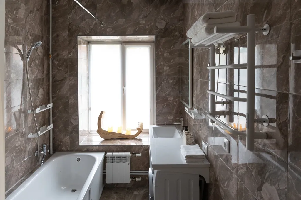 Санузел оборудован ванной, раковиной, унитазом, полотенцесушителем, феном, гигиеническими принадлежностями.