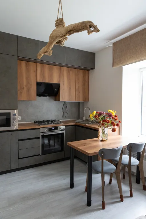 В кухне-студии – кухонный гарнитур, гардеробная система, диван-кровать 140 см на 200 см, стол и стулья.