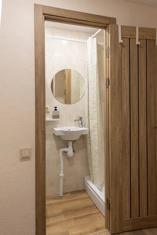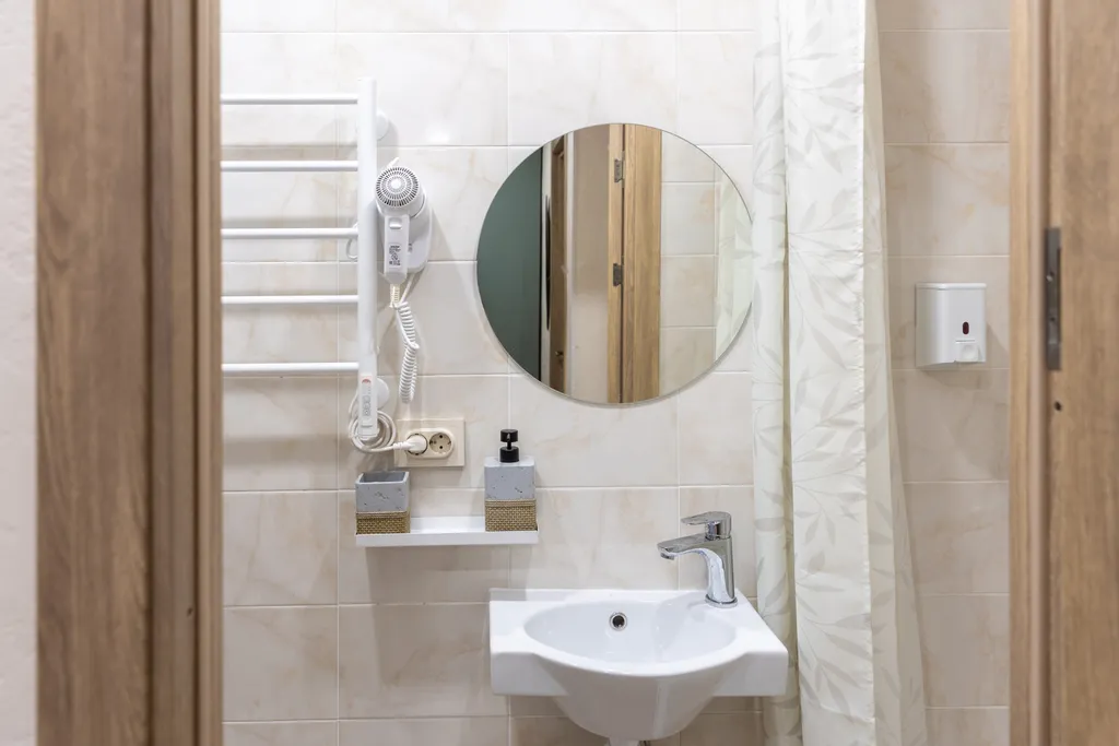Санузел оборудован душем, раковиной, унитазом, полотенцесушителем, гигиеническими принадлежностями.