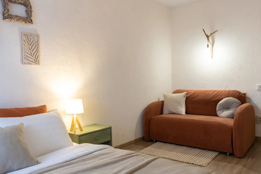 В комнате - двуспальная кровать 160см на 200см с ортопедическим матрацем, диван-кровать 120см на 190см, комод, прикроватная тумбочка.