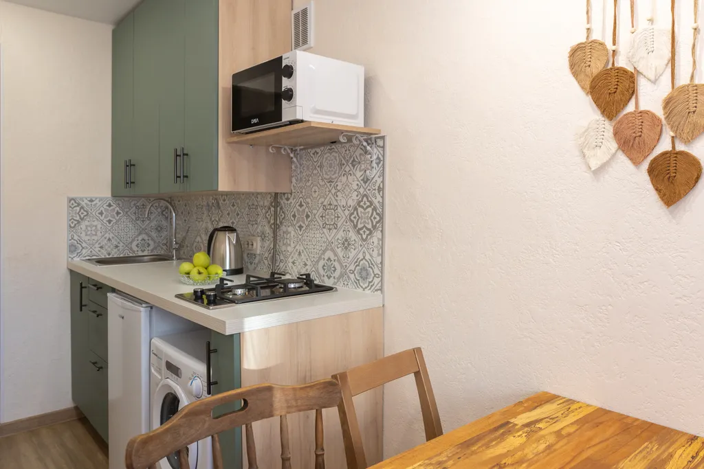 На кухне – все необходимое для приготовления и приема пищи, холодильник, чайник, стол и стулья.